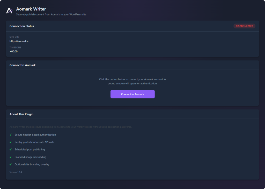 If you are running Writer as a standalone plugin without Suite, you will find Aomark Writer as its own item in your WordPress sidebar. Click it and you will land on the Writer dashboard showing your Site URL and connection status. Click Connect to Aomark and the popup handles authentication the same way.